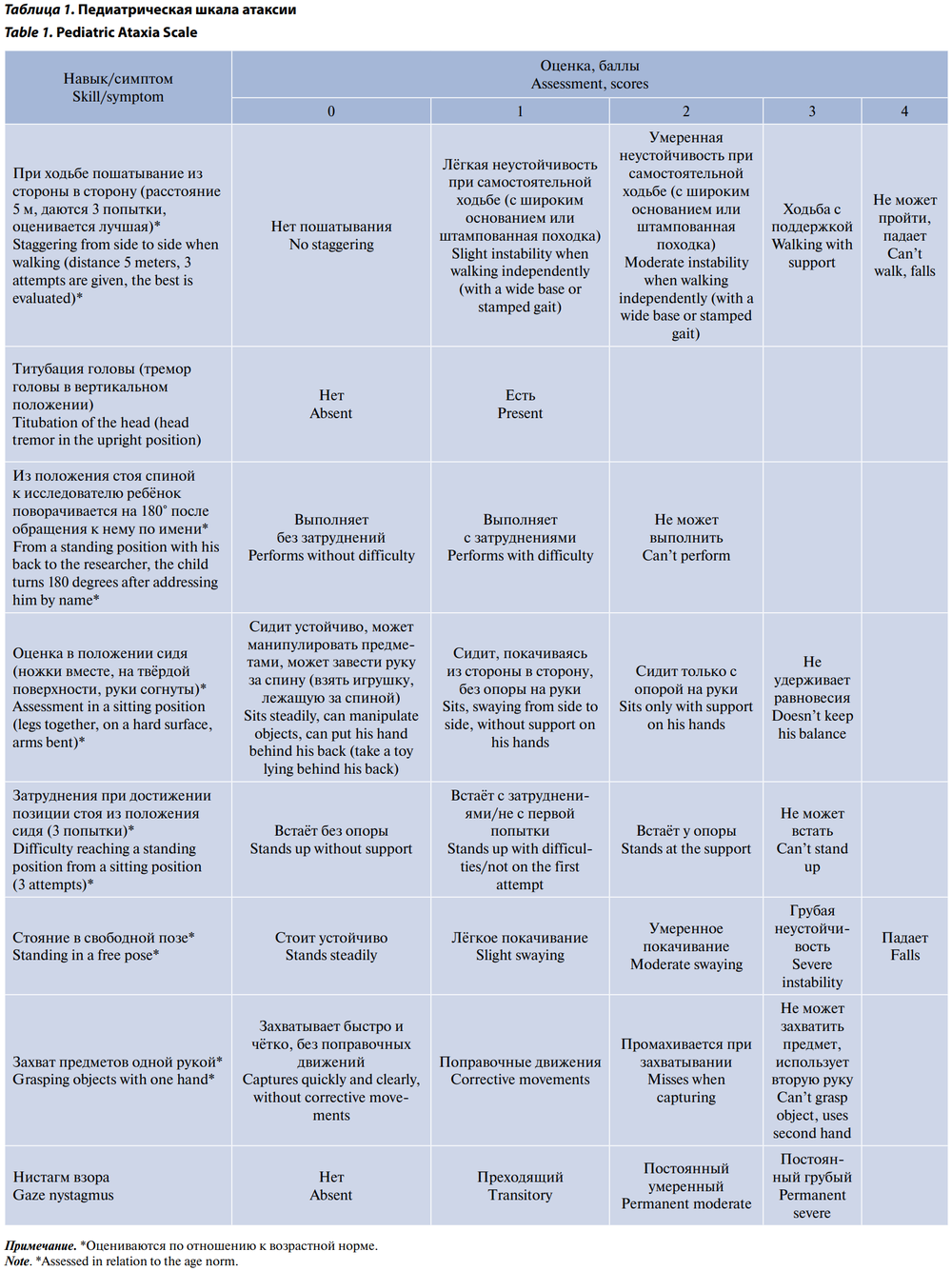 Всем детям проводилась детальная оценка анамнеза: анализ течения беременности, родов, становления двигательных, психических и речевых функций, текущего неврологического и соматического статуса. Для оценки психомоторного развития у детей до 6 лет использовался Денверский скрининговый тест [18]. Выраженность двигательных нарушений оценивали с помощью шкалы GMFSC [19], степень тяжести атаксии — по разработанной нами Педиатрической шкале атаксии (ПША) (табл. 1).