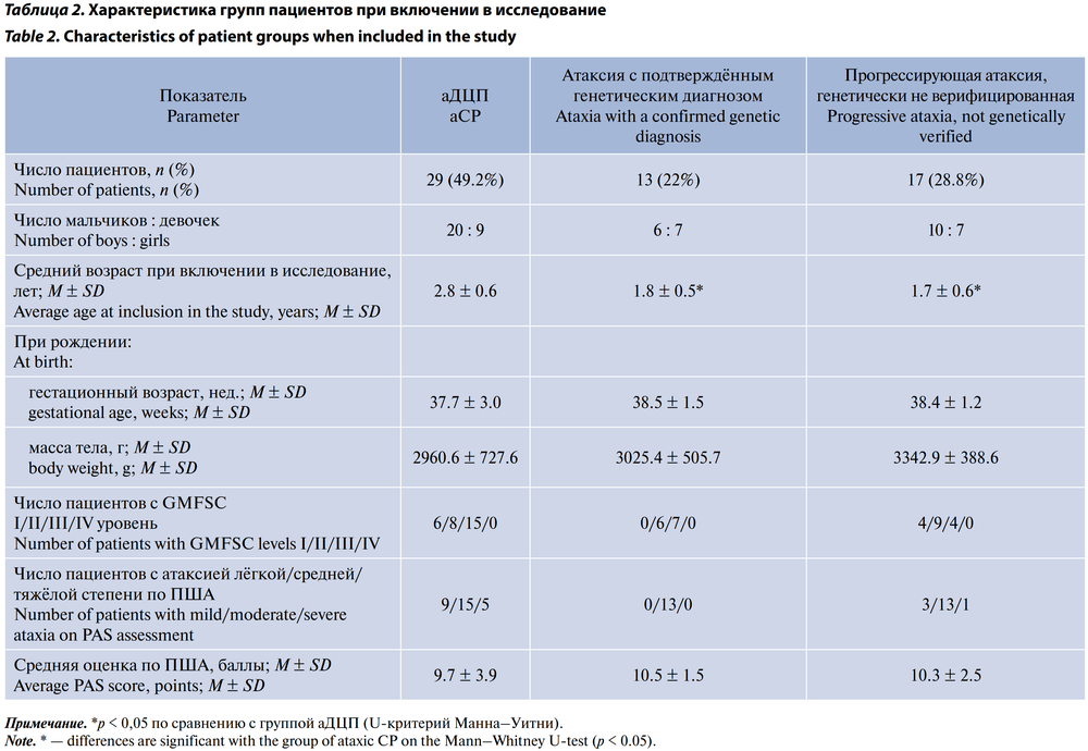 Средний возраст на момент включения в исследование был несколько выше в группе аДЦП (2,8 года), что представляется логичным, т. к. окончательный диагноз ДЦП чаще выставляется позже, после попыток самостоятельной ходьбы. В группах наследственной и предположительно генетической атаксии средний возраст был ниже (1,8 и 1,7 года соответственно), что может быть связано с ранней манифестацией выраженной неврологической симптоматики и её дальнейшим нарастанием. При этом пациенты 3 групп существенно не различались по гестационному возрасту и массе тела при рождении.
