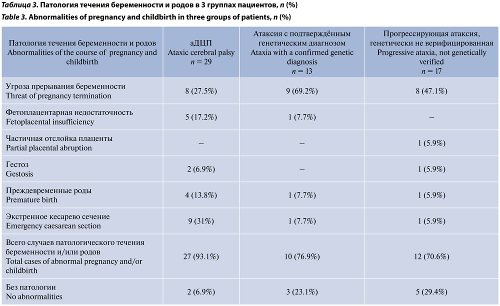 С другой стороны, угроза прерывания беременности чаще встречалась в анамнезе пациентов с атаксией с подтверждённым (69,2%) и предполагаемым (47,1%) диагнозом генетического заболевания, чем в группе пациентов с аДЦП (27,5%).