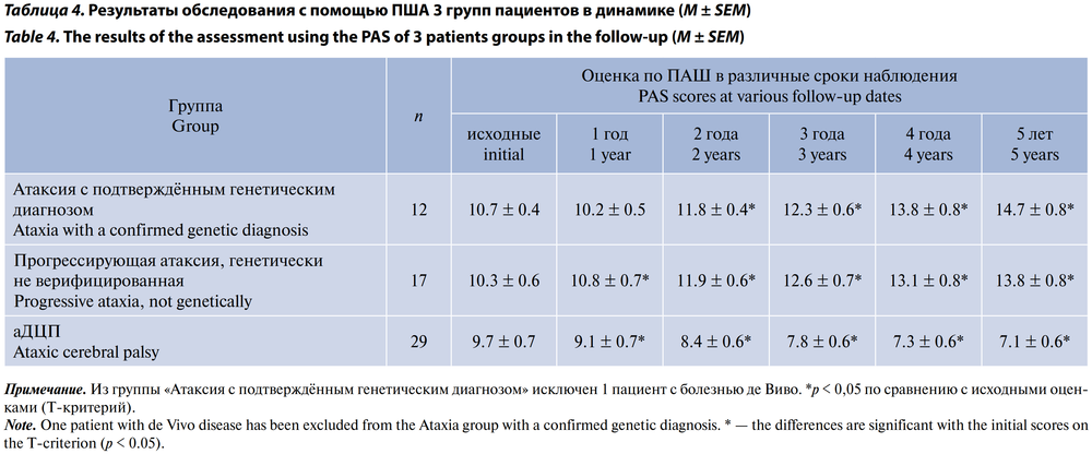 При включении в исследование между группами отсутствовали значимые различия средних балльных оценок по ПША, и у большинства пациентов определялась атаксия средней тяжести. Однако динамика оценок по ПША за 5-летний период наблюдения пациентов оказалась разнонаправленной: у детей с аДЦП они имели тенденцию к стабилизации и постепенному улучшению, тогда как для пациентов групп с наследственными и предположительно генетическими атаксиями характерным было их неуклонное ухудшение в связи с нарастанием двигательных расстройств (табл. 4). Следует подчеркнуть сходство динамики показателей по ПША у пациентов двух последних групп.
