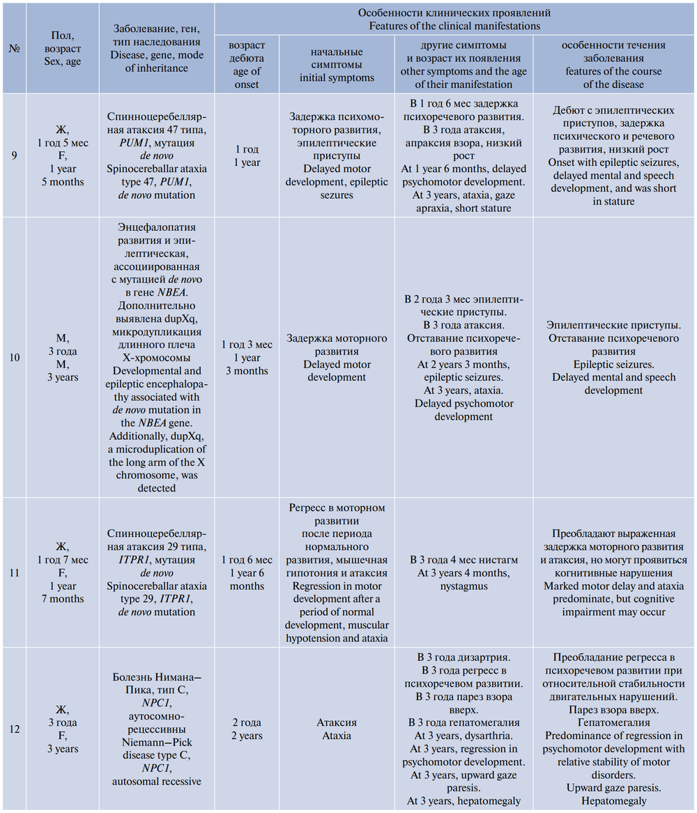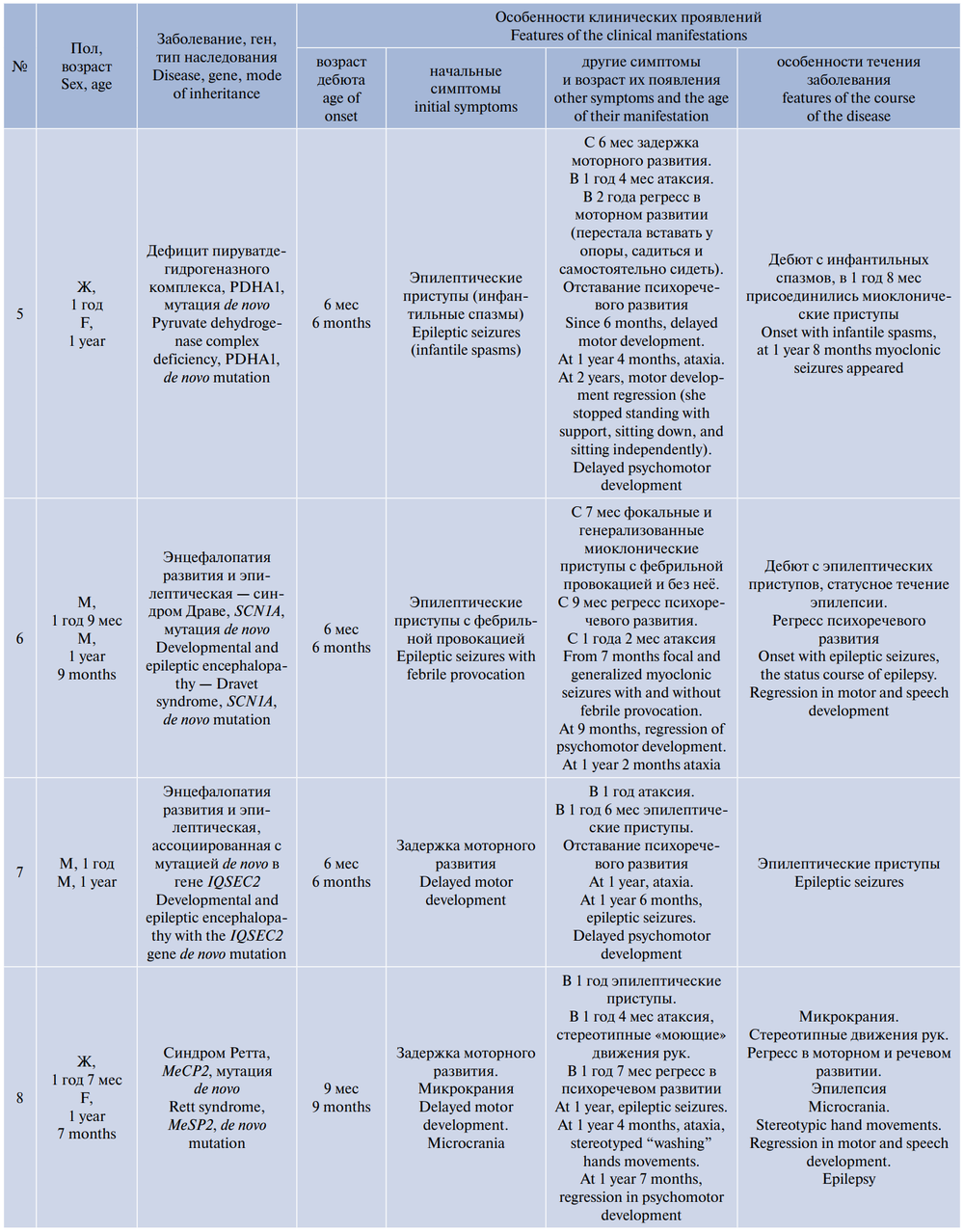 У 13 (22%) пациентов наследственные заболевания были подтверждены методами генетической диагностики и лабораторными исследованиями. У 12 из них (за исключением 1 пациента с болезнью де Виво) наблюдалось прогрессирующее течение заболевания (табл. 5).