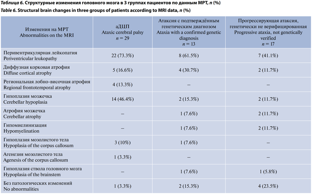 По данным МРТ, в группе аДЦП преобладали изменения, типичные для гипоксически-ишемического поражения в виде перивентрикулярной лейкопатии (73,3%). Другой часто выявляемой патологией была гипоплазия мозжечка (46,4%). В группе наследственно обусловленной атаксии перивентрикулярная лейкопатия встречалась несколько реже (61,5%), другими находками были корковая атрофия (30,7%), гипомиелинизация (7,6%), гипоплазия ствола мозга (7,6%) и атрофия мозжечка (7,6%).