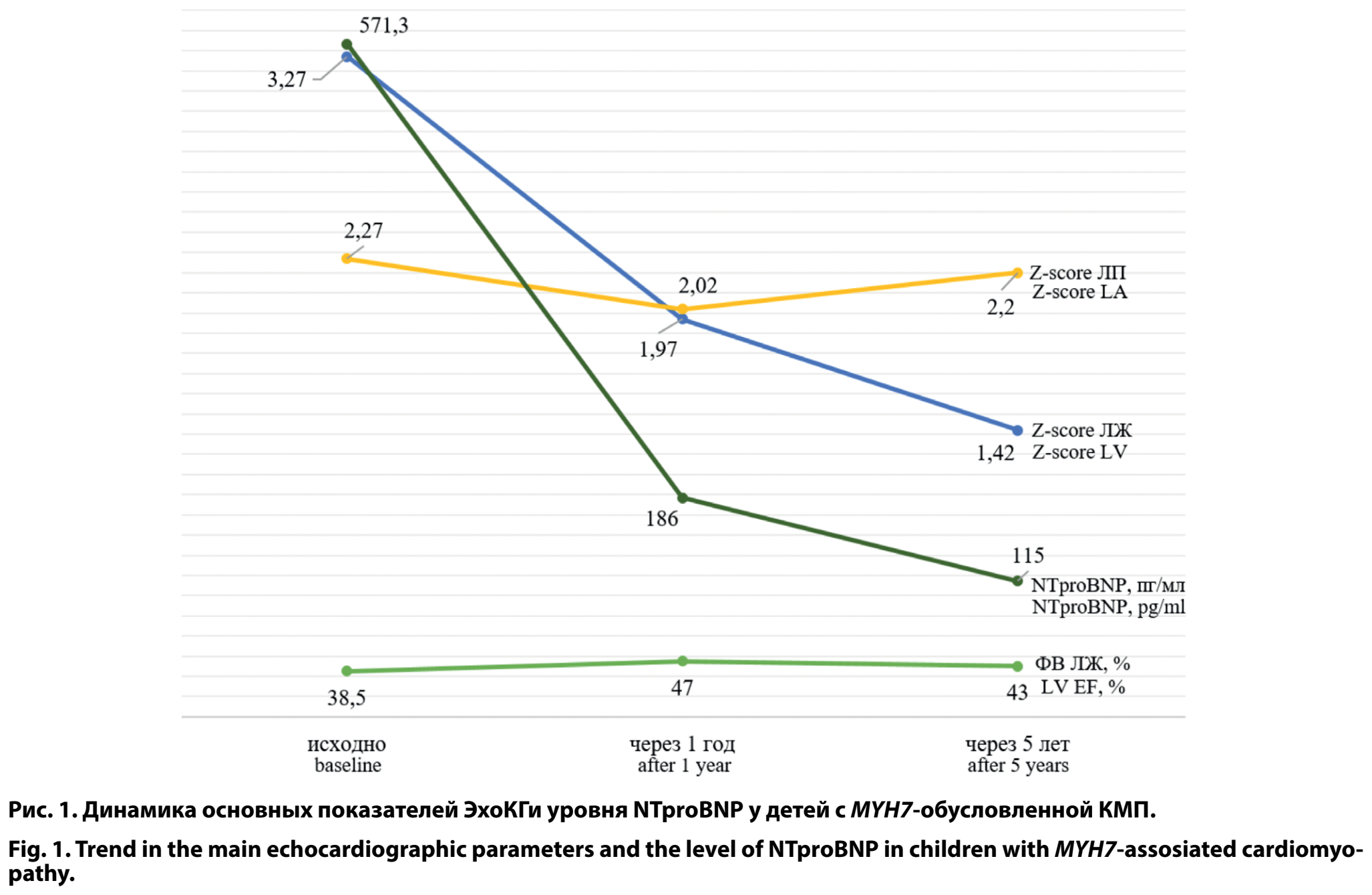 ДКМП традиционно характеризуется прогрессирующим течением с развитием ХСН, частыми аритмиями и высоким риском неблагоприятных исходов [3, 7, 31]. Однако в нашем исследовании пациенты с патогенными вариантами в гене MYH7 на фоне адекватной медикаментозной терапии ХСН продемонстрировали относительно благоприятную динамику: нормализовался размер ЛЖ, улучшилась сократительная способность, снизился уровень NTproBNP, не регистрировалось клинически значимых нарушений сердечного ритма, а также высокую 5- и 10-летнюю выживаемость. Наши данные согласуются с результатами исследования 147 взрослых пациентов, где было показано, что у 18% пациентов заболевание впервые проявилось до 18 лет, при этом течение болезни характеризовалось относительно благоприятным прогнозом, частота жизнеугрожающих аритмий была низкой (до 2%), а у многих пациентов наблюдалось обратное развитие ремоделирования миокарда [34]. Эти данные позволяют предположить существование более доброкачественного фенотипа заболевания у пациентов с вариантами в гене MYH7. На основании регистрируемого в течение 5 лет увеличения дилатации ЛП можно предположить, что некомпактный миокард выступает в роли фактора, провоцирующего нарушения диастолической функции в отдалённом периоде.