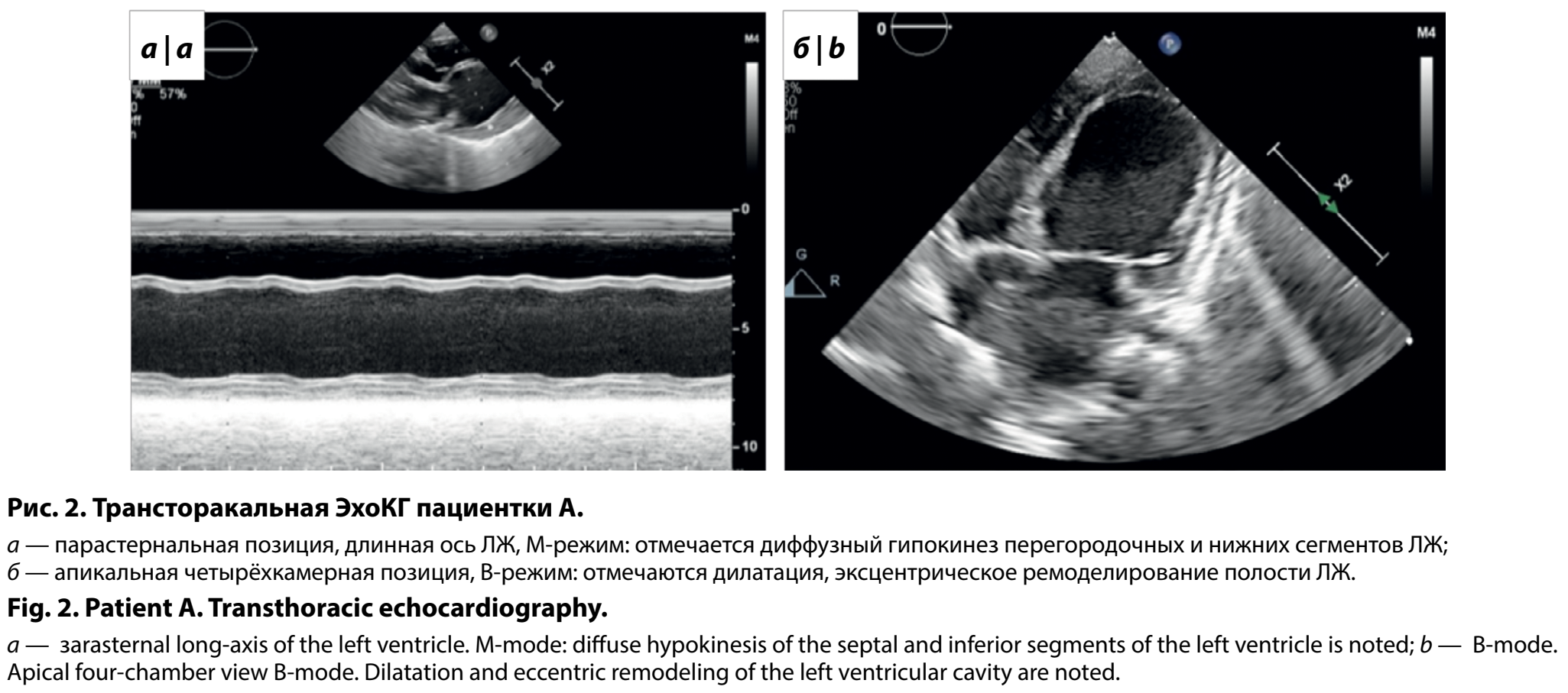 В 15 мес девочка впервые госпитализирована в кардиологическое отделение Центра по системе телемедицины. При поступлении обращало на себя внимание низкое, дисгармоничное физическое развитие (вес 8,3 кг, рост 74 см), диффузная мышечная гипотония. По результатам обследования сохранялся высокий уровень NTproBNP — 2889 пг/мл, отмечалось снижение параметра креатинфосфокиназы до 11 ЕД/л. По данным ЭхоКГ отмечена дилатация ЛЖ до 3,6 z-score и ЛП до 4,2 z-score, снижение ФВ до 13% по Симпсон, давление в системе лёгочной артерии составило 50 мм рт. ст., выявлены признаки некомпактного миокарда ЛЖ (рис. 2). По результатам рентгенографии органов грудной клетки кардиоторакальный индекс составил 71%. При проведении ЭКГ-исследования, включая СМ-ЭКГ, значимых нарушений ритма сердца и проводимости не регистрировалось. За период пребывания в отделении девочке была скорректирована медикаментозная терапия сердечной недостаточности. При контрольном плановом обследовании состояния через 6 мес получены следующие данные: уровень NTproBNP 2469 пг/мл; сохранялись эхо-признаки ремоделирования по дилатационному фенотипу без значимого изменения параметров; нормализовалось давление в системе лёгочной артерии; уменьшились рентгенологические размеры сердца (кардиоторакальный индекс 69%); по данным СМ-ЭКГ обращали на себя внимание эпизоды синусовой тахикардии без эктопической активности. Терапия была скорректирована в соответствии с результатами обследования.