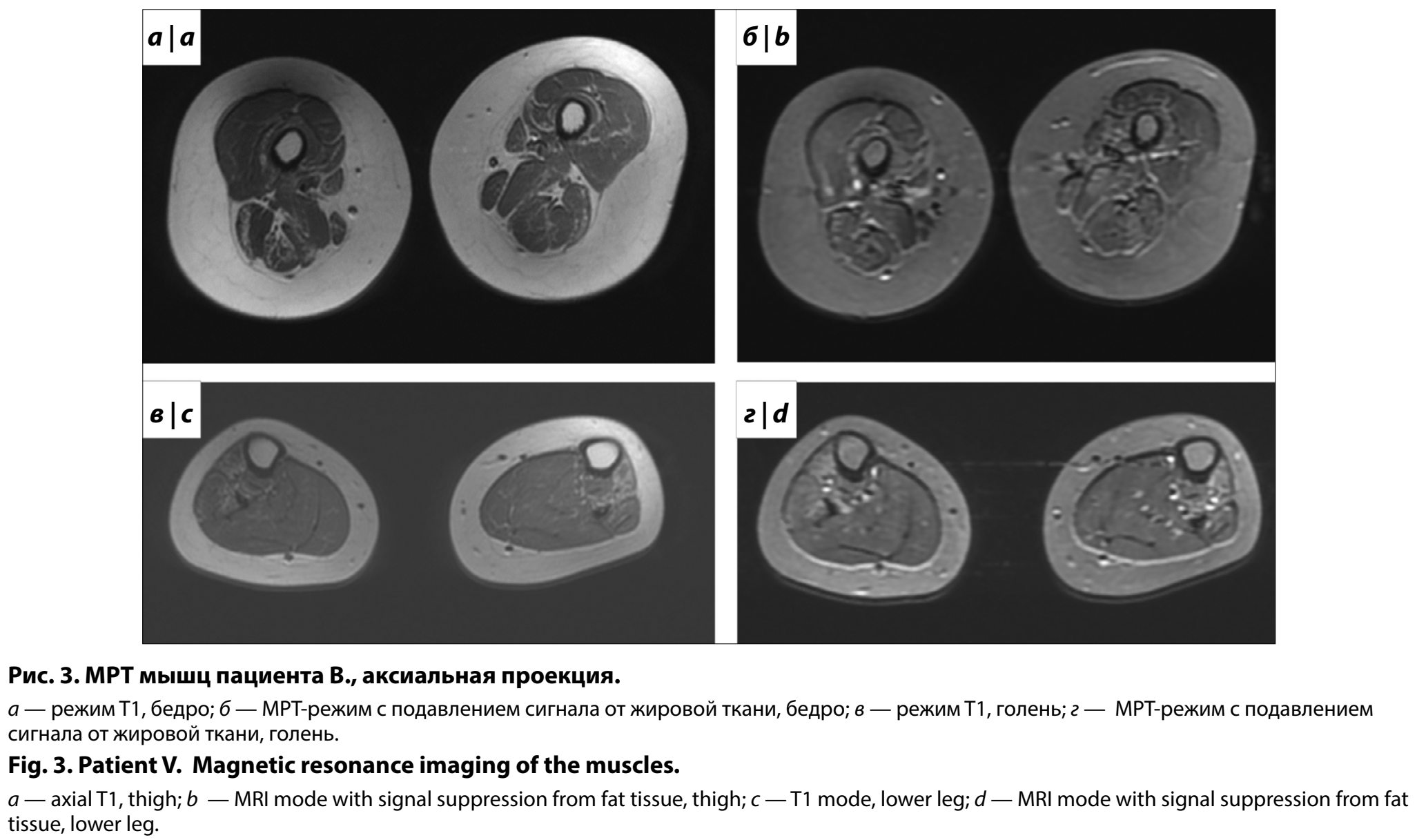 В 11 лет впервые направлен в Центр, проведено МРТ мышц (рис. 3) — картина билатеральной атрофии мышц бедра с неравномерной жировой инволюцией, более выражены изменения задней группы мышц, минимально визуализируется билатеральная атрофия мышц с неравномерной жировой инволюцией в передней группе мышц голени (затронуты большеберцовая и малоберцовая мышцы и сгибатели пальцев стопы). Неврологический осмотр: черепные нервы без очаговой патологии. В двигательной сфере: объём пассивных и активных движений не ограничен. Мышечный тонус снижен в руках и ногах. Мышечная сила в верхних конечностях снижена, достоверно до 3–4 баллов, в нижних конечностях — до 3 баллов в дистальных отделах, до 4 баллов в проксимальных отделах. Не может ходить на пятках. Сухожильные рефлексы с рук равномерно снижены, коленные — с двух сторон отсутствуют, ахилловы — вызываются, D = S. Клонусов стоп нет. Патологические стопные симптомы отрицательные с 2 сторон. Брюшные рефлексы живые. Использует приёмы Говерса при вертикализации (не может самостоятельно подняться с пола из положения лежа/сидя). Поднимается по лестнице, опираясь на поручень. Походка — степпаж. Грубых координаторных нарушений нет. Пальце-носовую пробу выполняет с лёгкой дисметрией. Нарушений чувствительности нет. Тазовые функции не нарушены.