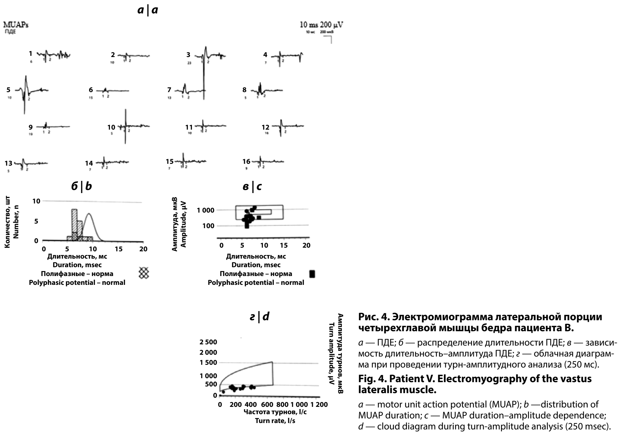 В нашем Центре проведена игольчатая электромиография (рис. 4): при игольчатом исследовании латеральной порции четырёхглавой мышцы бедра слева зарегистрированы ПДЕ со средней длительностью 7,1 мс (норма 9,3 мс), т. е. снижение на 23,7%. Доминируют ПДЕ с достоверно укороченной длительностью. Средняя амплитуда — 489 мкВ, среднее число фаз 4, полифазных ПДЕ — 15%. В покое спонтанная активность не выявлена. При проведении турн-амплитудного анализа больше половины (60%) полученных значений расположены вне нормативной облачной диаграммы. Паттерн рекрутирования ПДЕ в каждой исследованной мышце — полный (табл. 2). Выявленные признаки указывают на мышечный тип поражения (средняя длительность ПДЕ значимо снижена, при турн-амплитудном анализе больше половины значений расположены вне нормативной облачной диаграммы, во всех тестированных мышцах паттерн рекрутирования ПДЕ полный). При этом скорость распространения возбуждения по периферическим нервам ног не снижена.