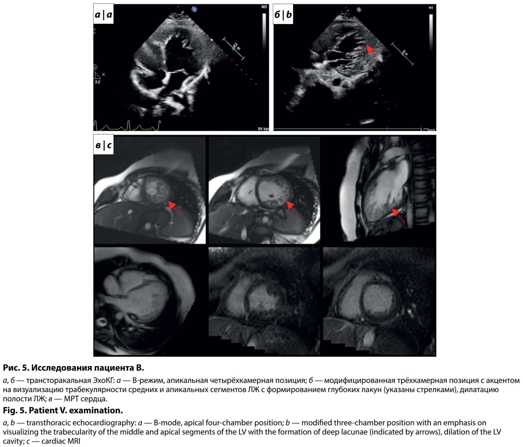 По результатам обследования в кардиологическом отделении Центра в 11 лет отмечен нормальный уровень NTproBNP (12,7 пг/мл). По ЭхоКГ выявлены признаки некомпактного миокарда апикальных и средних сегментов ЛЖ в соотношении 22:6 мм, сферичность полости ЛЖ (индекс сферичности 0,9), пограничный размер полости ЛЖ (Z-score = 2), снижение ФВ по Симпсон до 43%, диастолическая дисфункция по 1-му типу (рис. 5, а, б). По результатам СМ-ЭКГ отмечена склонность к тахикардии, δ-волна в большинстве отведений, значимых нарушений ритма сердца и пауз ритма не регистрировалось. Проведено МРТ сердца (рис. 5, в), подтвердившее некомпактный миокард, снижение функциональных параметров обоих желудочков (ФВ ЛЖ = 39%, правого желудочка — 51%), гипокинез перегородки на всем протяжении, зон фиброза не определялось. Подростку подобрана терапия сердечной недостаточности, продолжено динамическое наблюдение за мальчиком.