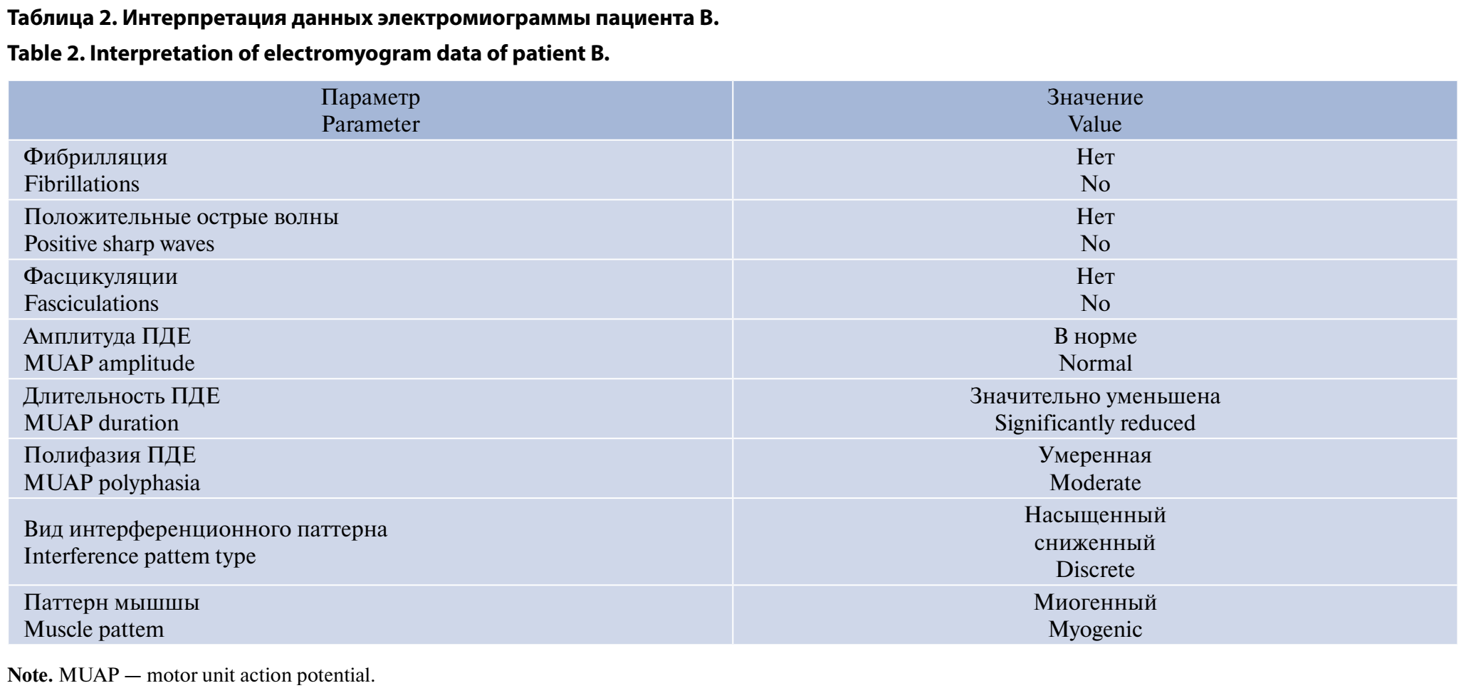 В неврологическом статусе со стороны черепных нервов очаговой патологии не выявлено. Диффузная мышечная гипотония с сохранными симметричными сухожильными и надкостничными рефлексами с верхних и нижних конечностей, ограничение объёма активных движений. Таким образом, у пациентки имеется миопатический симптомокомплекс. В 11 мес по месту жительства проведена игольчатая электромиография, выявлены признаки первично-мышечных изменений мышц верхних и нижних конечностей со снижением амплитуды и длительности потенциалов двигательных единиц (ПДЕ) исследуемых мышц (слева длительность ПДЕ 5,21 мс, амплитуда 137 мкВ, справа — 4,12 мс и 153 мкВ) и изменением паттерна активации по миопатическому типу.